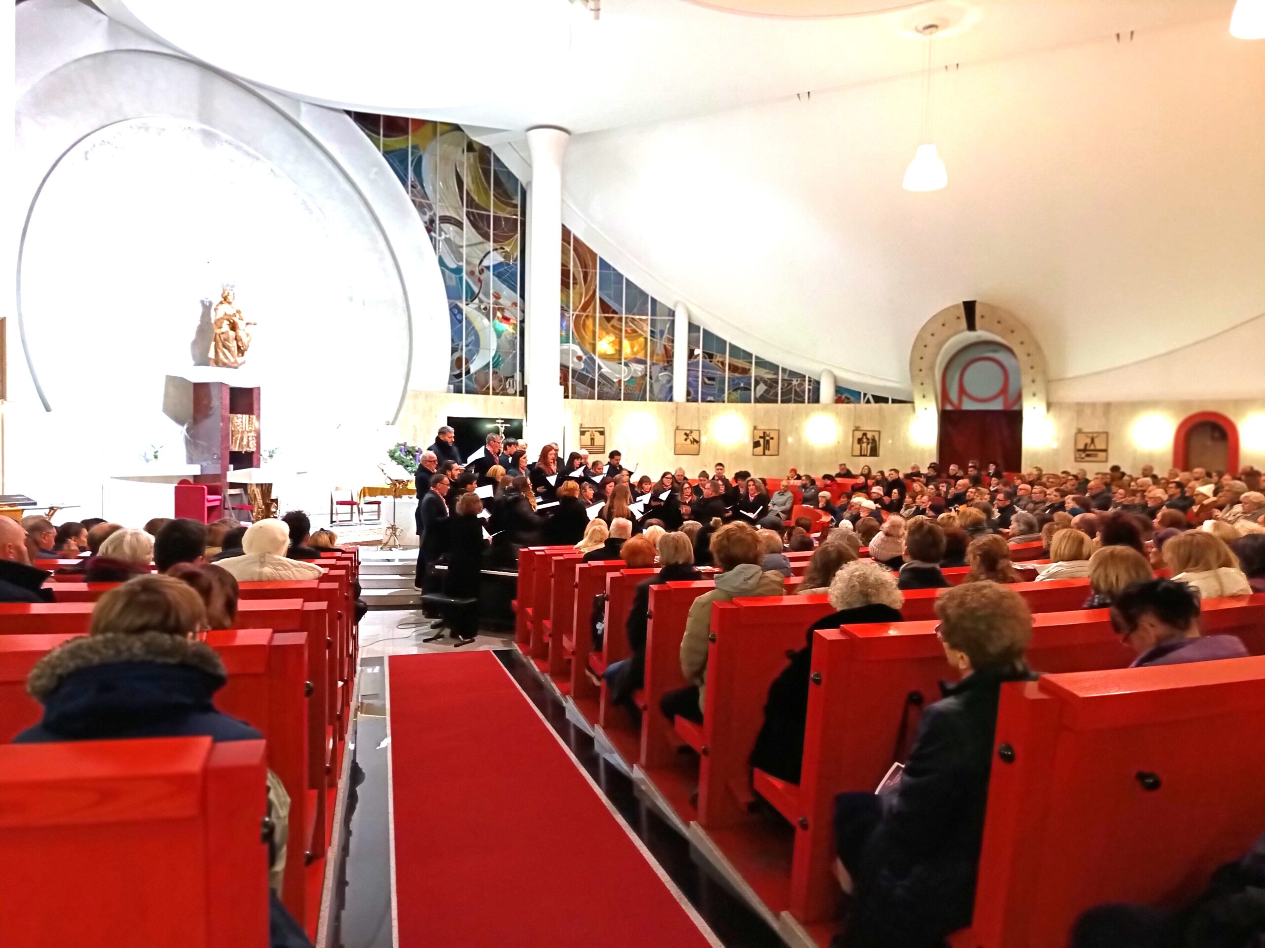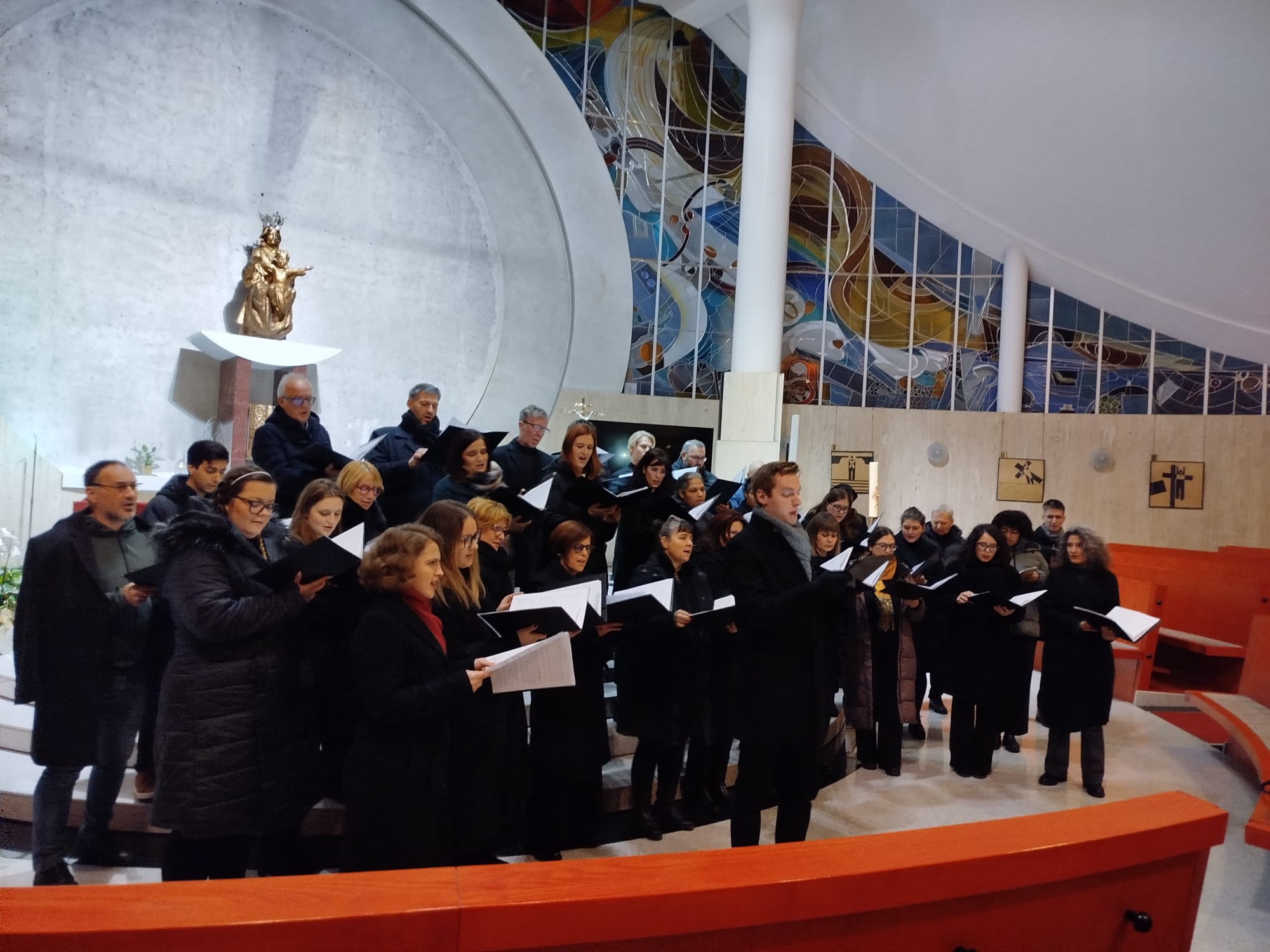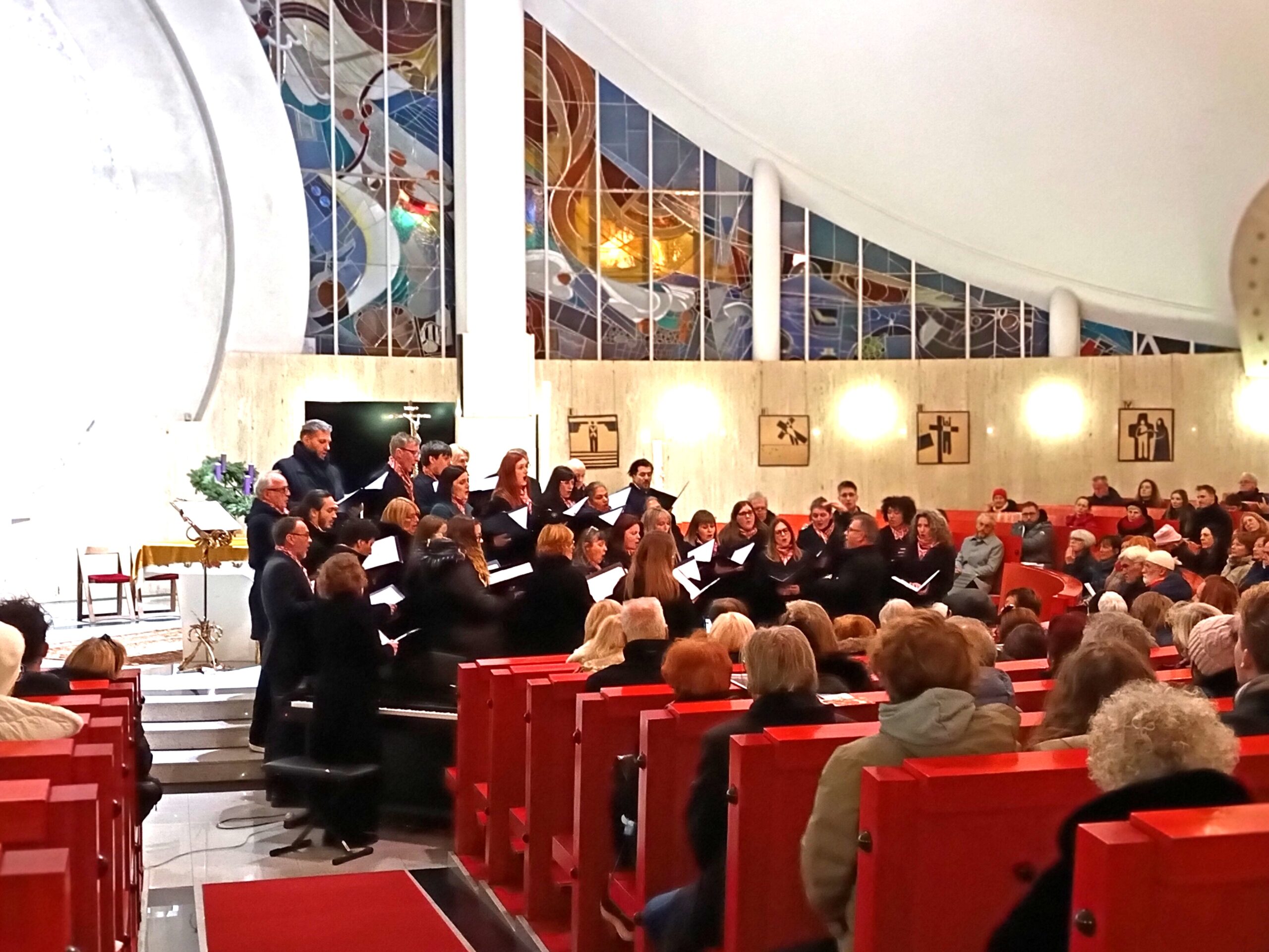 V druge delu adventno-božičnega koncerta se nam je zbor s solisti predstavil pred publiko, pred oltarjem, kjer je zbor najprej zapel melodijo Pridi, pridi, Emanuel, skladatelja Zoltana Kodalya in nato skladbo Petra Corneliusa Kralji. Sledil je solistični vložek Nocoj, nocoj je sveta noč, in O luč z neba, slovenskega avtorja Egija Gašperšiča. Zbor nam je še zapel znano angleško božično melodijo When a Baby iz born in koncert zaključil z znano Stolzovo melodijo Cveti vrtnica v božičnem času, ki so jo zapeli skupaj zbor in solisti ob spremljavi Mete Podlesnik Marčič na klavirju.