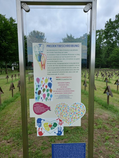 In še eno presenečenje. Na tem vojaškem pokopališču so otroci 3. razreda osnovne šole Lang postavili tablo s pozivi, kako se boriti proti vojni v vsakdanjem življenju in uporabljati mir kot nenasilno obliko. Otroci svetujejo vsem: “Tu in tam se umaknite za korak nazaj, zaradi sprave in miru!”