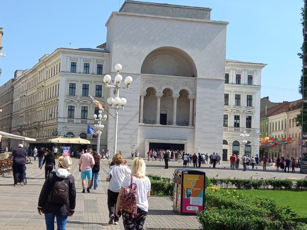 Drugi dan našega potepanja po Romuniji smo že dopoldne odšli v gledališče v Temišvar. Zanimivo, v tem gledališču imajo opero ter tri dramske ansamble, romunskega, nemškega in madžarskega. Opero so v Temišvaru zgradili v letih 1871-1875 v italijanskem neo-renesnačnem slogu, zunanjo fasado pa v letih 1934-1936 v neobizantinskem slogu. Šele ko vstopiš v opero, se ti odpre pravi stari dunajski teater s številnimi okraski.